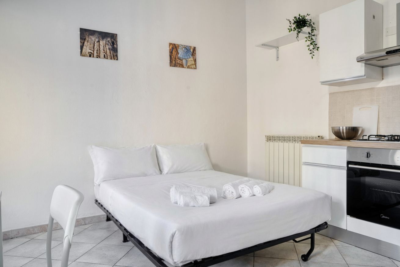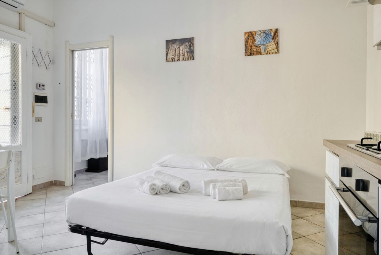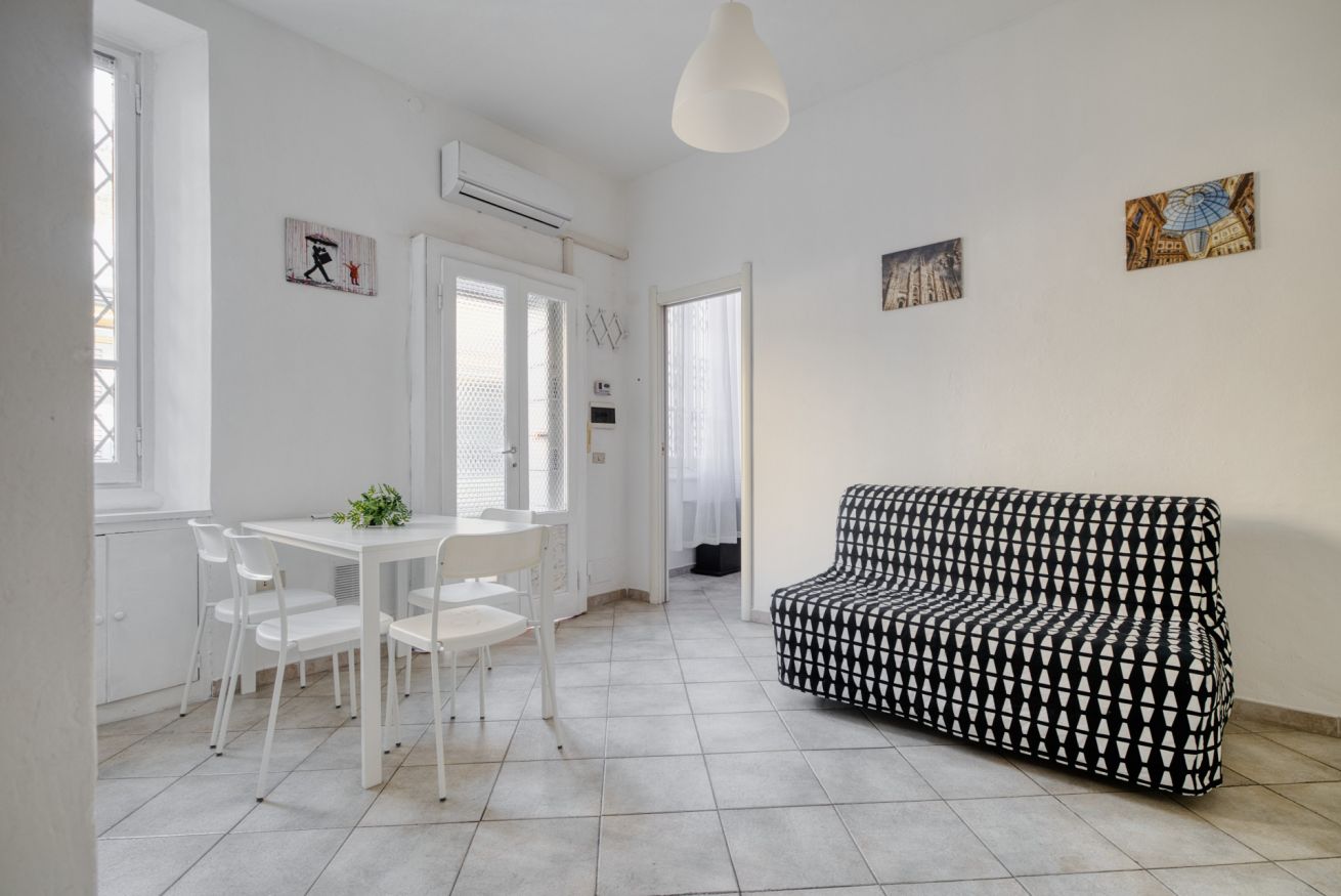 L'appartamento, composto da camera da letto, salotto con divano letto e cucina e bagno con box doccia può ospitare da 1 a 4 persone ed è sito al secondo piano di una tipica casa di corte Meneghina.